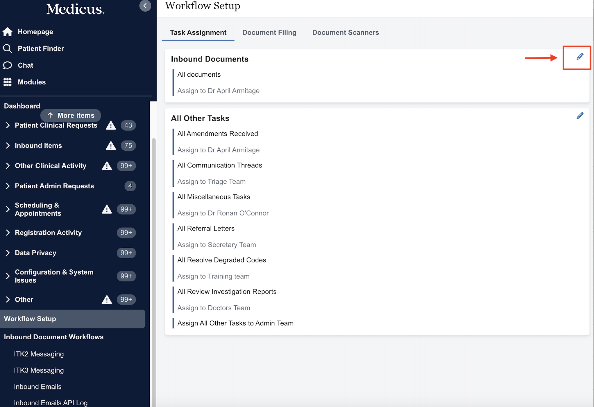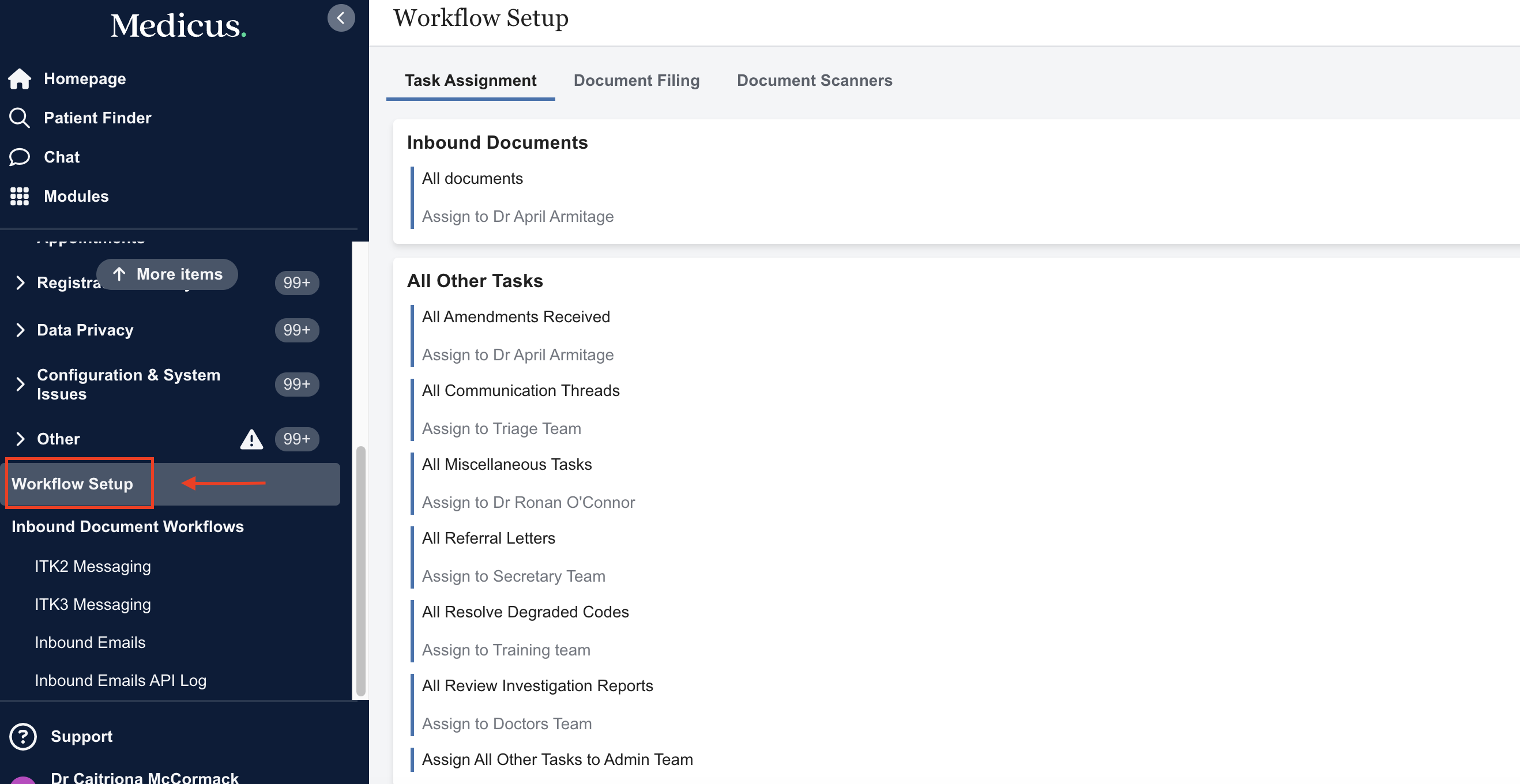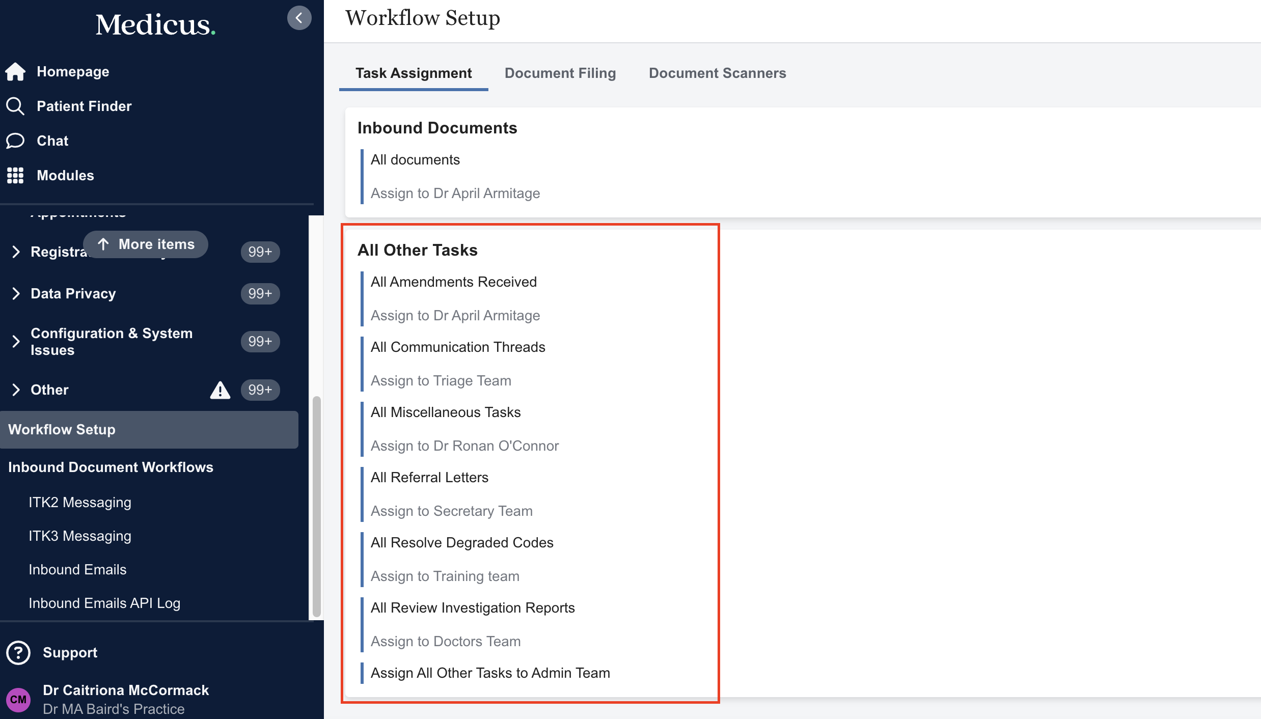 The Inbound document assignee in Medicus is used in instances where there is no assignee specified for a particular task type. For example, if theres a new task type introduced and no assignee has been assigned yet, those tasks will be assigned to the Inbound document assignee.
