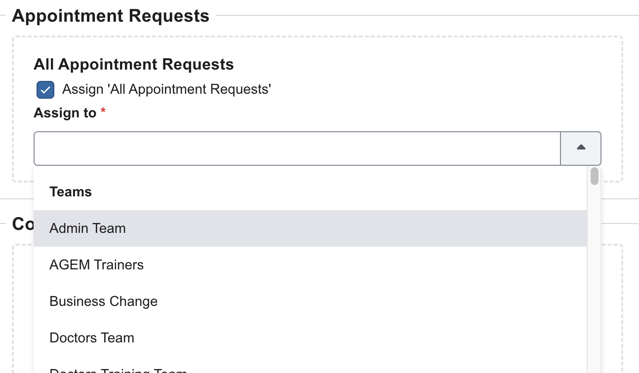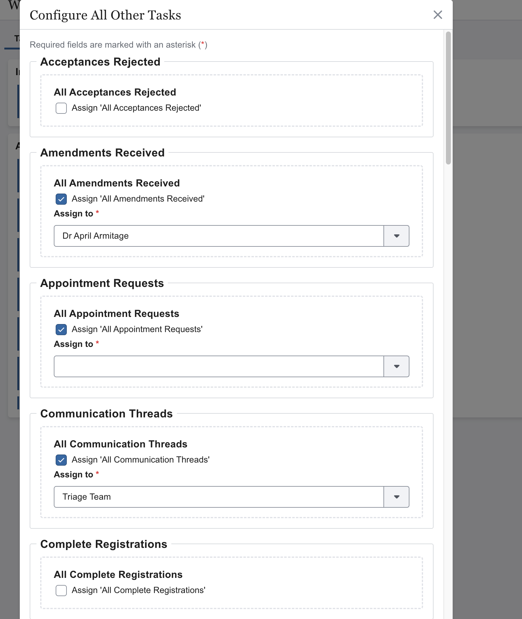 For each task type tick Assign all “{task type}” to enable an automatic rule. A dropdown will appear, allowing you to select either an individual staff member, or a team. Configure as many task types as needed.Ensure the All Other Tasks rule has an assignee selected (this is mandatory). Select Save changes.