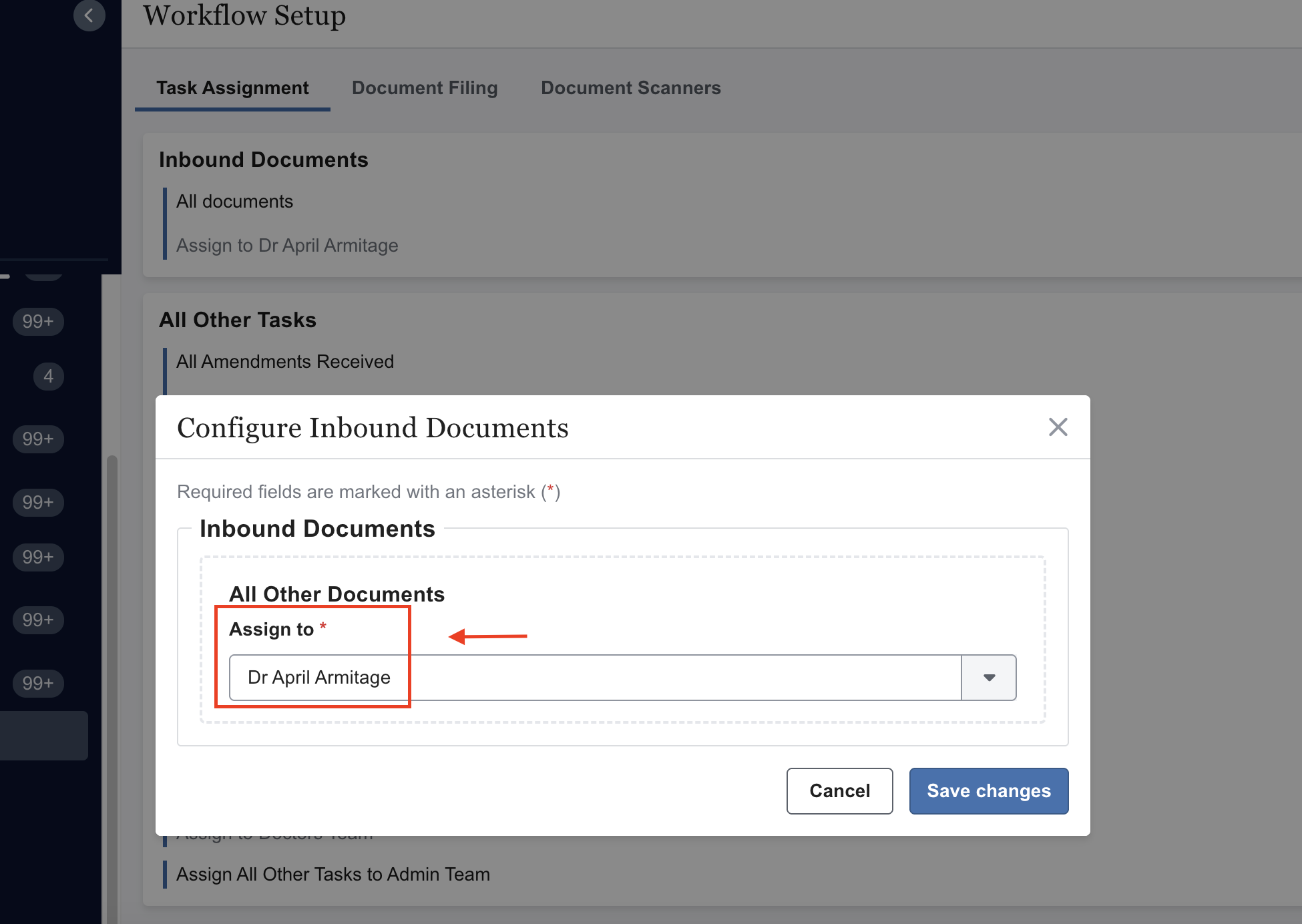 This will open up a pop-out form to edit the Inbound document assignee. Select a staff member from the dropdown list and select the 'Save changes' button.
