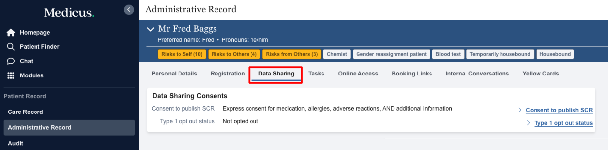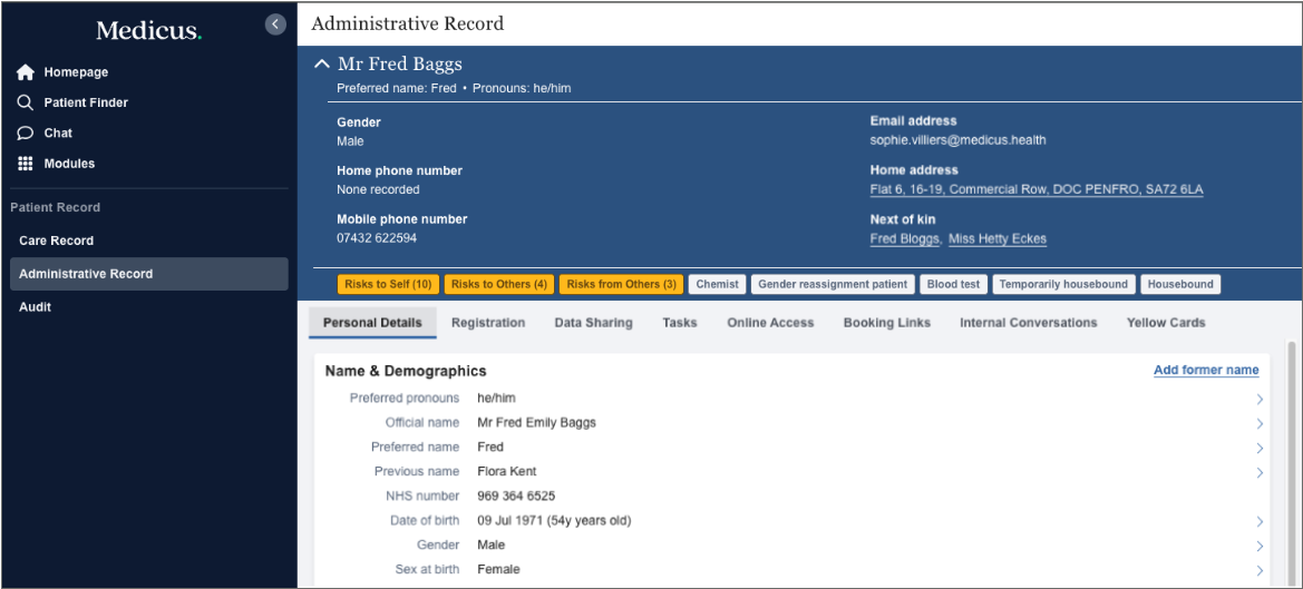 The patient's administrative record contains all of the none clinical information related to a patient. This includes contact information, demographic details, registration, data sharing consent and communication preferences. This guide will show you how to view information on a patient's administrative record.