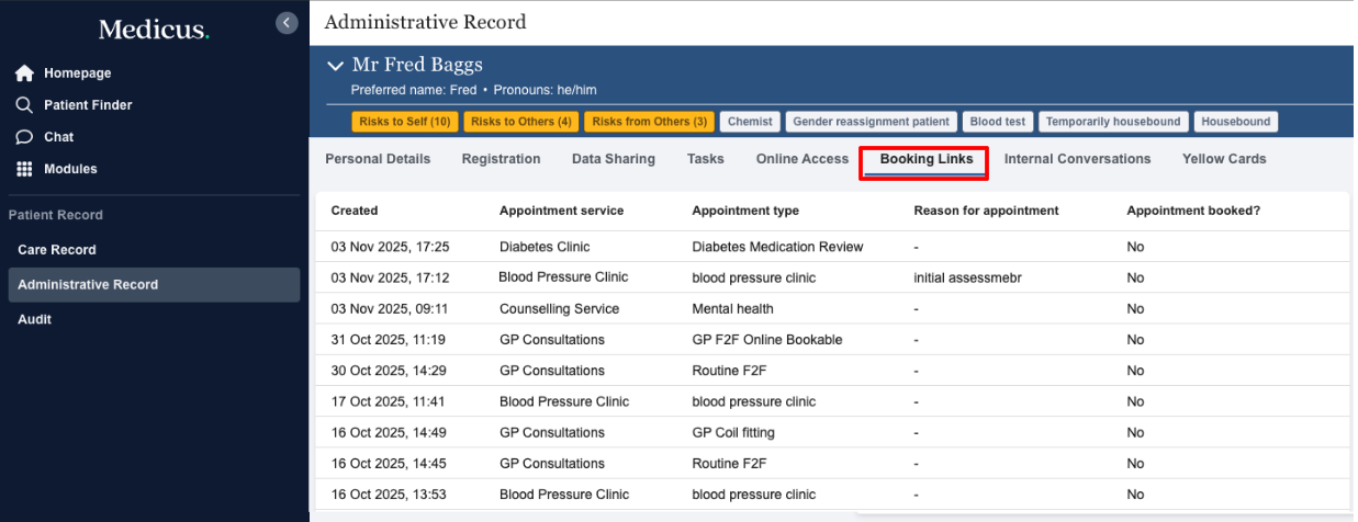 The Booking Links tab shows all booking links generated for a patient. It will show when the link was created, the appointment service and type, the reason for the appointment and whether an appointment was booked via the link. Clicking onto an appointment will show further information, like who sent the booking link to the patient.
