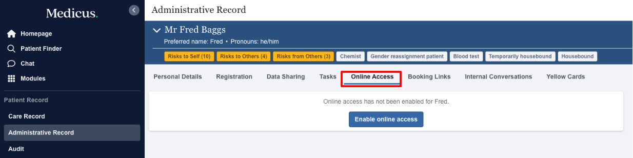 The Online Access tab allows you to grant the patient online access to their patient record.