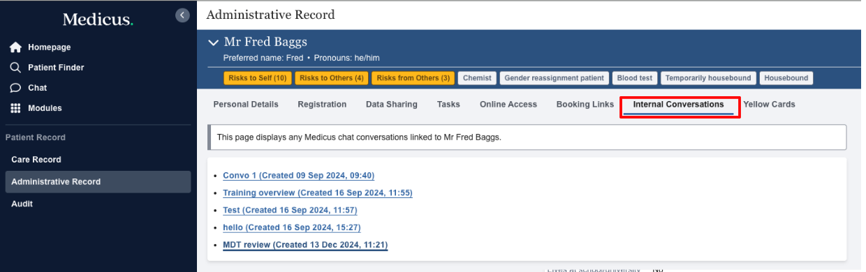 The Internal Conversations tab will show any internal conversations linked to the patient.