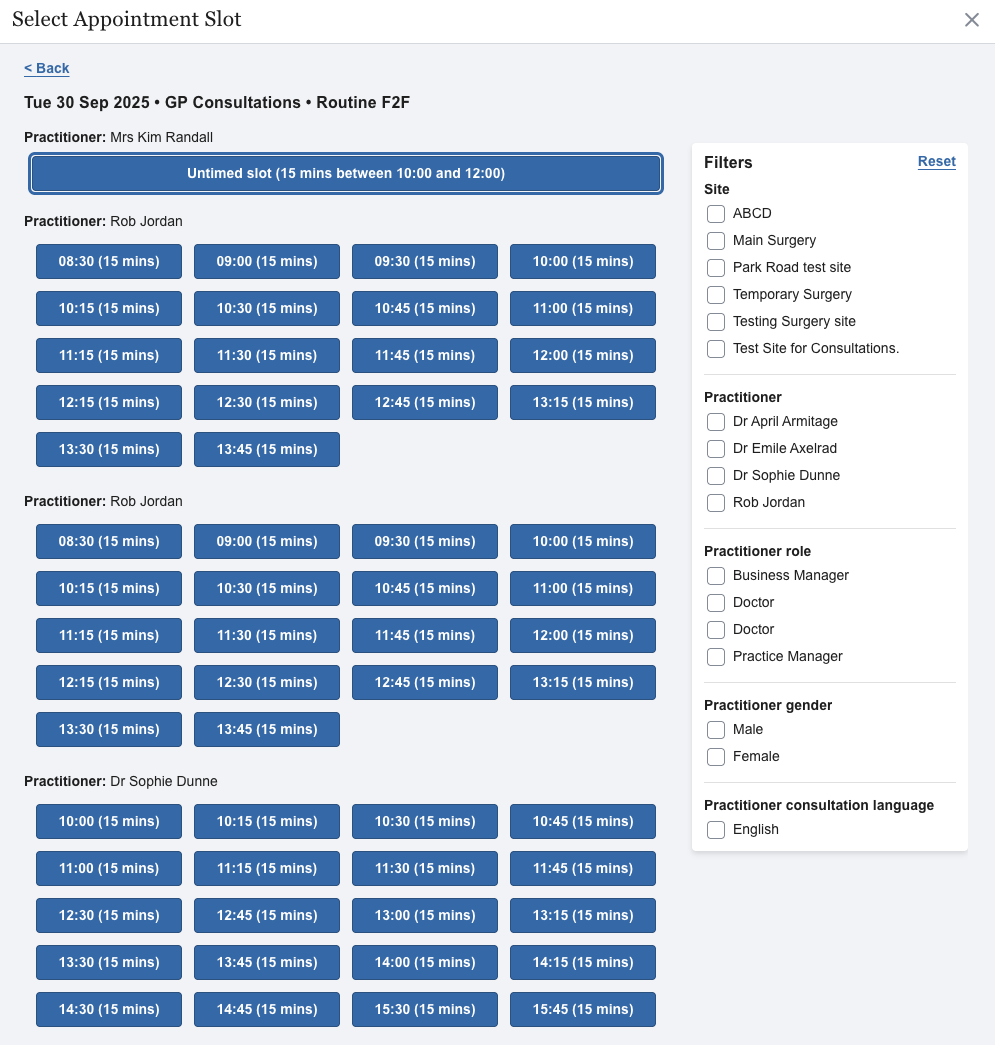 If the diary is timed then the available appointments are shown as timed appointment slots seen in the screenshot below.