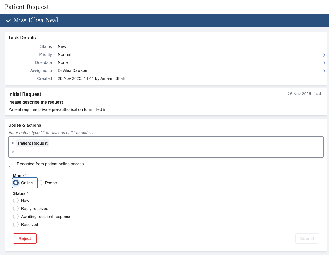 Details of the patient request form can be seen under the Initial Request section of the task details.