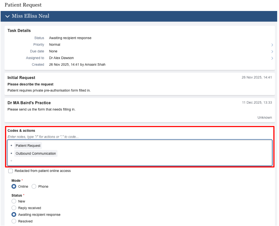 If you would like to redact the patient request from being visible via online access, you can do this within the task by selecting Redacted from patient online access.