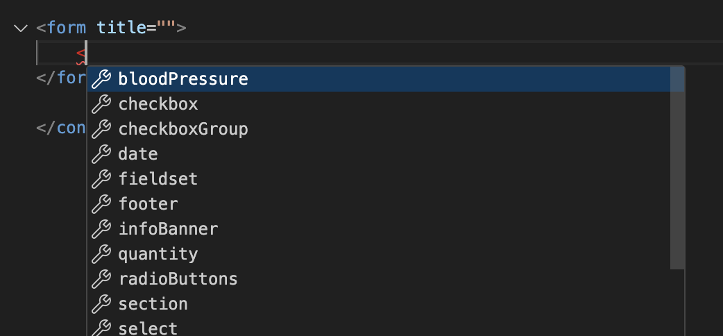 path/to/your-schema.xsdwith the relative path to your XSD file. For example:/Users/timgray/ConsultationTemplate.xsd - If you have setup the schema correctly then you should start to get autocomplete suggestions like this: