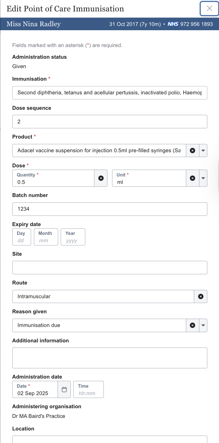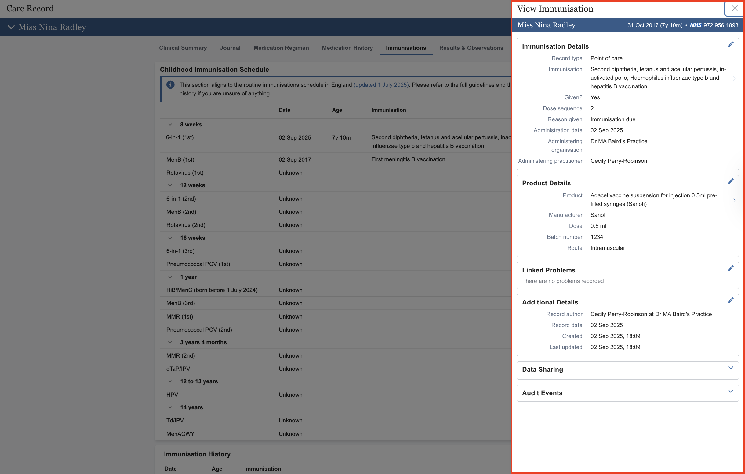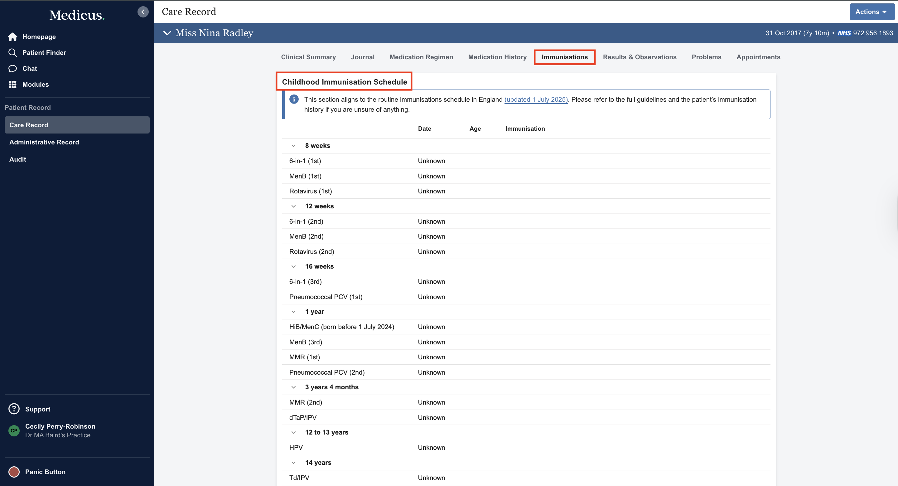Note: All childhood immunisations can also be viewed within the patient's journal.