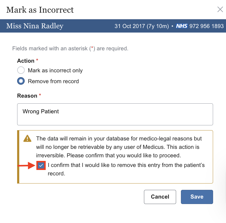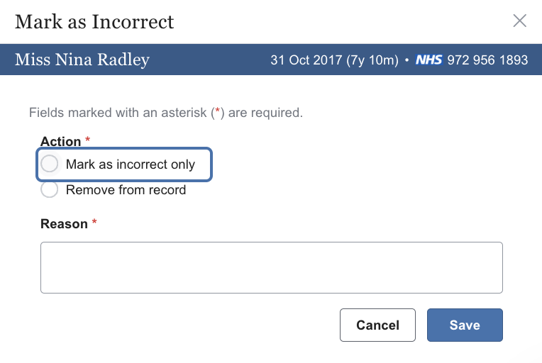 Marking an entry as incorrect will strike it through, but it will remain visible in the immunisation record and can be reversed if needed. Removing an entry, however, permanently deletes it from the record with no trace. To do this, you must tick the box 'I confirm that I would like to remove this entry from the patient's record' before selecting 'Save'.