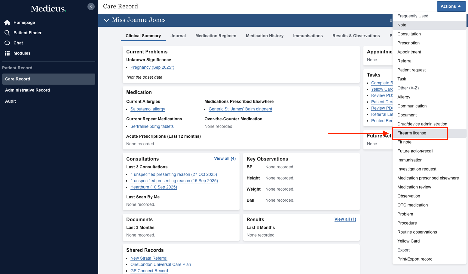 To record a Firearms application or notification in Medicus, select 'Actions' in the top right hand corner and then select 'Firearm License'.