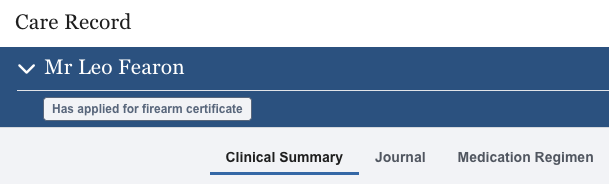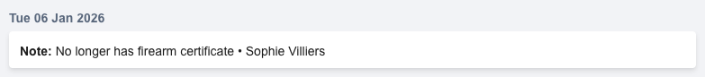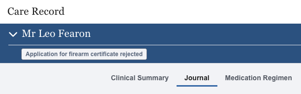 Notification that the patient no longer has a firearm/shotgun certificate - shown as a Note on the Patient's Journal