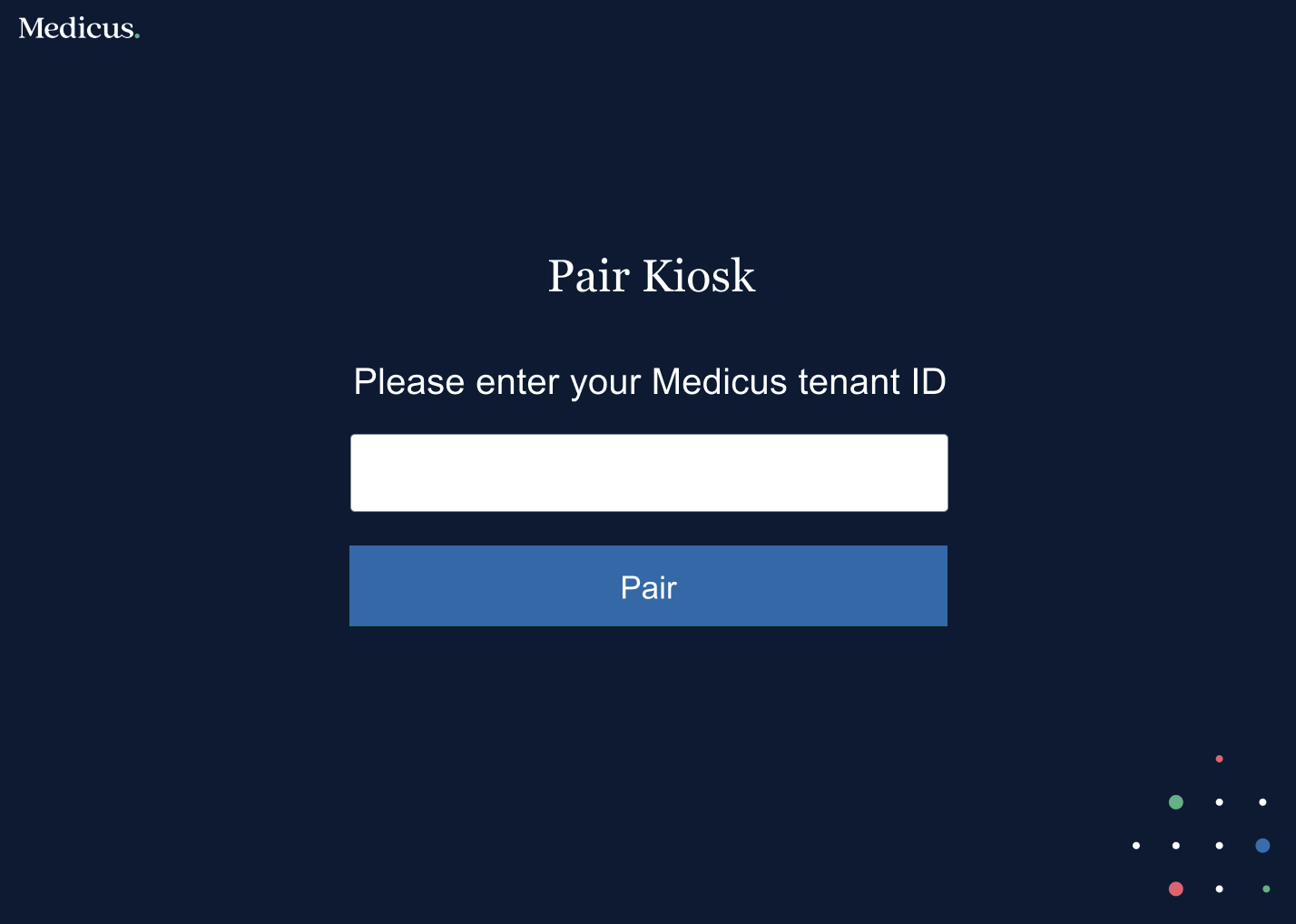 Before patients can use the kiosk, it needs to be paired with your Medicus account. This is a two-step process: the kiosk submits a pairing request, and a Medicus user then approves it.