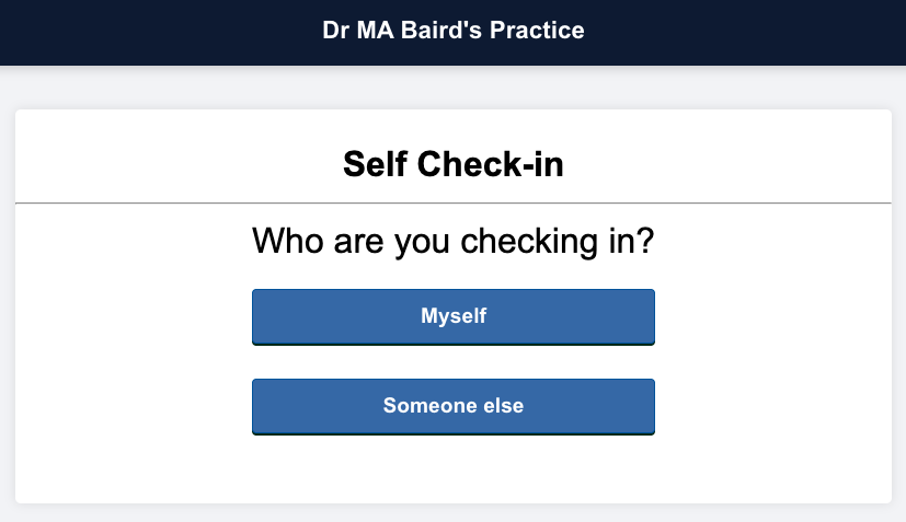 First, the patient selects who they are checking in for: Myself or Someone else.