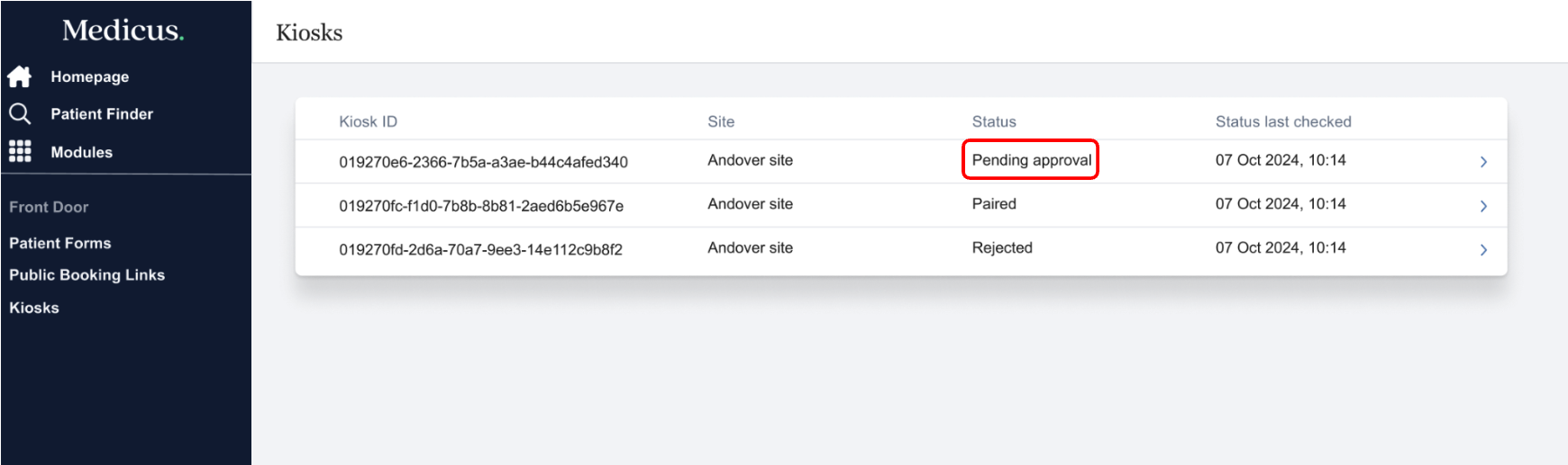 Once the tablet has submitted a pairing request, it will appear in Medicus at Modules > Front Door > Kiosks.