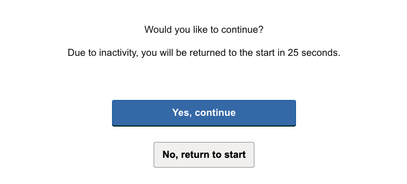 The patient can select Yes, continue to carry on, or No, return to start to go back to the beginning. If the countdown reaches zero, the kiosk returns to the start screen automatically.